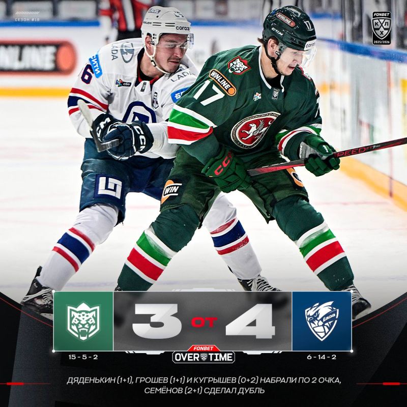 Казанский «Ак Барс» проиграл тольяттинской «Ладе» со счетом 3:4 в овертайме в домашнем матче регулярного чемпионата «Фонбет» — КХЛ.В составе победителей шайбы забросили Евгений Грошев (7-я минута), Иван Романов (34), Андрей Обидин (52) и...