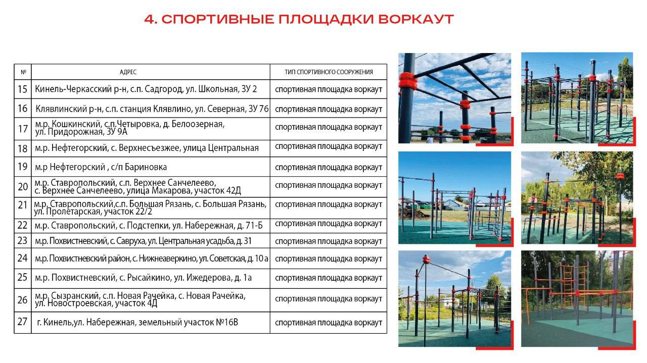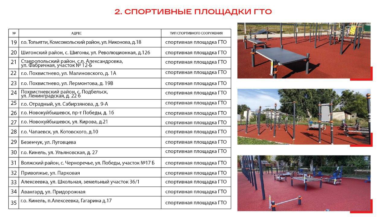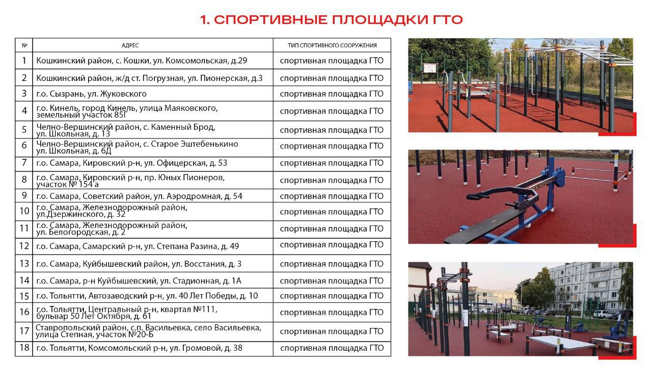 «Это полноценные площадки для сдачи норм ГТО, мини-футбольные поля, полноценные универсальные площадки, «коробки» для игр в хоккей, а также площадки воркаута. Открываем мы их по мере готовности и ввода в эксплуатацию. По ряду адресов продолжаются работы, уверен уже в этом году жители Самарской области смогут опробовать эти объекты и получат возможность заниматься физкультурой в шаговой доступности от дома»,