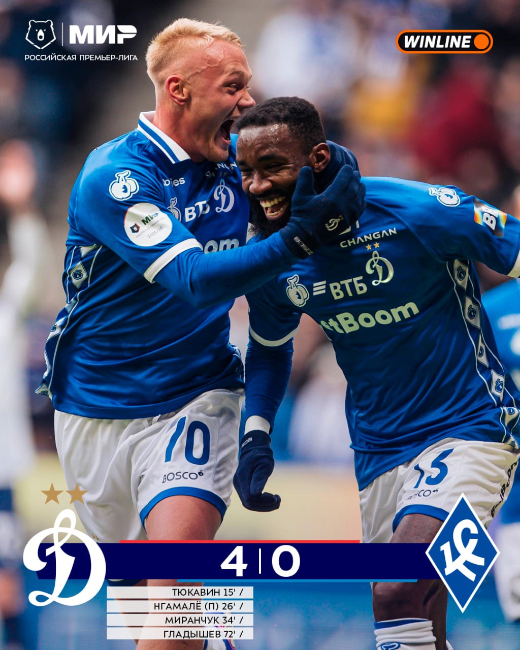 Московское «Динамо» обыграло самарские «Крылья Советов» в 19-м туре РПЛ со счетом 4:0.