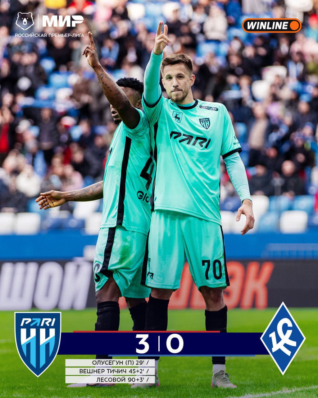 Голы забили Олакунле Олусегун (29-я минута, с пенальти), Лука Тичич (45+2) и Даниил Лесовой (90+3).